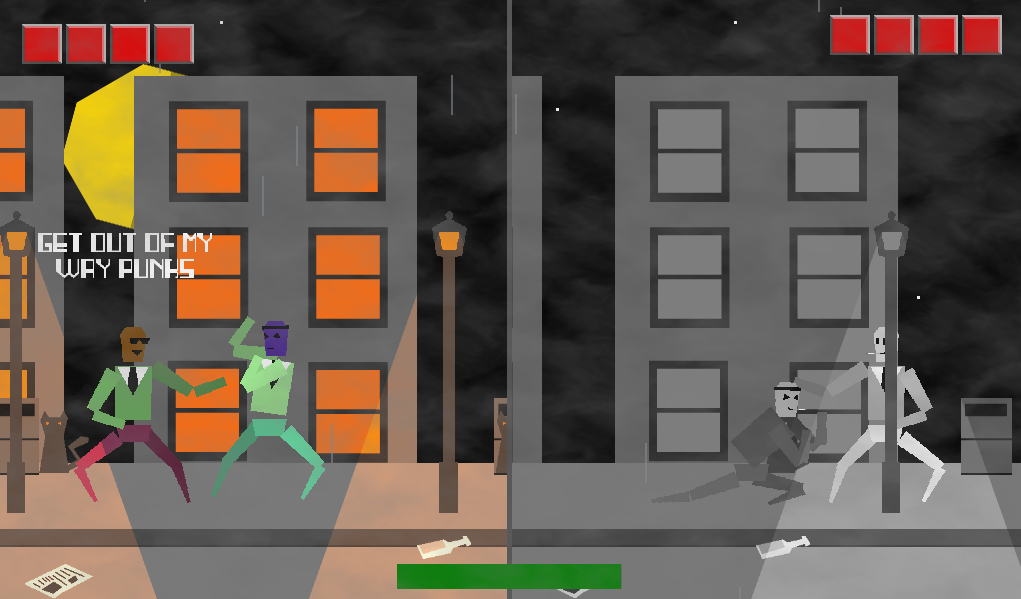 the game is a co-op game where two players need to work together to beat up street thugs until they can finally meet again. only one player can attack while the other blocks, this can be switched but on a cooldown requiring planning and jolly co-operation between the players. the game has random enemy spawning, character design, length, environment, and voice lines.